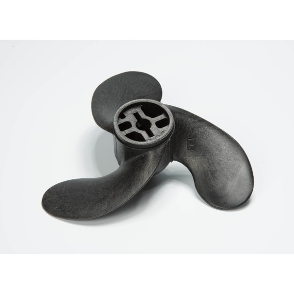 新品の船外機に装着されているメーカー純正の樹脂プロペラです。
