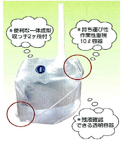 次世代超低公害ディーゼル車に導入される尿素SCRシステムに対応した排ガス脱硝用尿素水です。 新ソフト容器シリーズ「「テンツーワン」 ・便利な取っ手2か所付10Lx2個セット ・漏れないスクリュー式ノズル付き ・残液確認ができ、大型トラックから小型トラックまで直接タンクへ注入できます ・ポリエチレン製タンク ・女性のいる職場や繰り返し作業の多い仕事環境でも片手で楽々持てるサイズで扱いやすいソフト容器