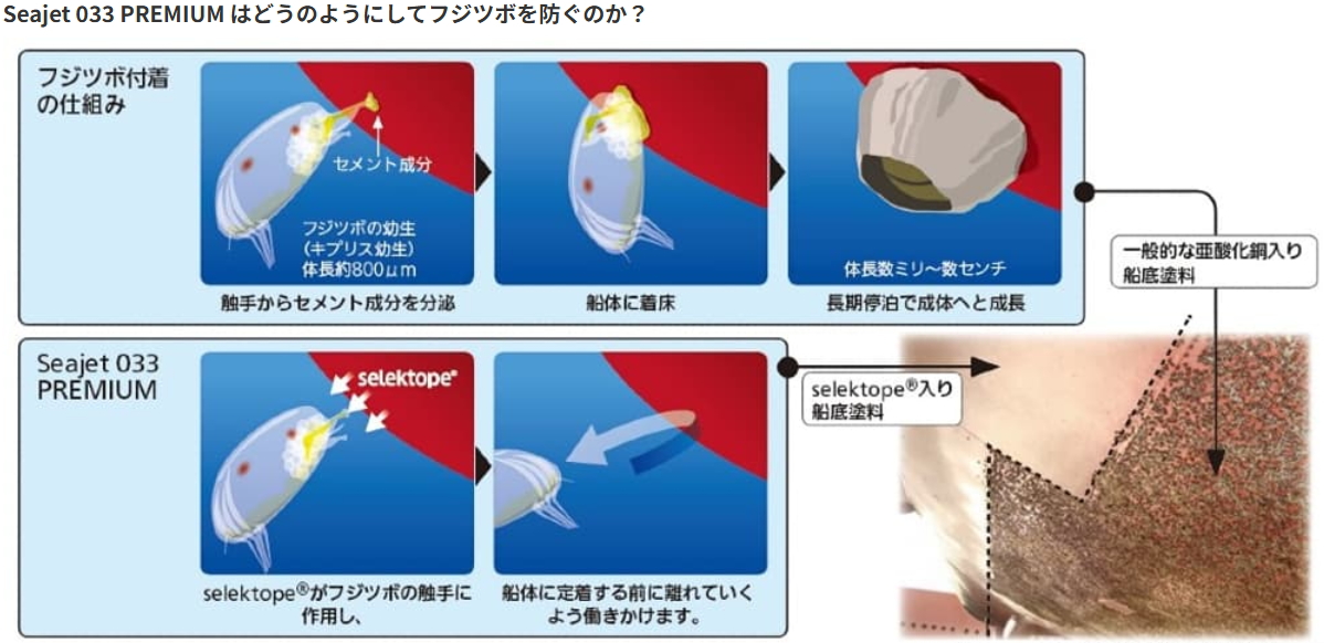 Seajet 033 PREMIUM は、革新的防汚剤「selektope®」を配合し、耐フジツボ性を強化した次世代型プレミアムグレードの防汚塗料です。
