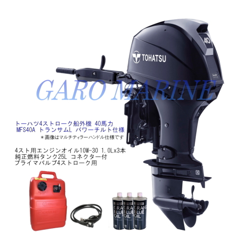 トーハツ 船外機 4ストローク 40馬力 MFS40A-ETL トランサムL パワーチルト仕様 エンジンオイル1.0Lx3本 燃料タンク25L 燃料ホース付 法人様発送 送料無料