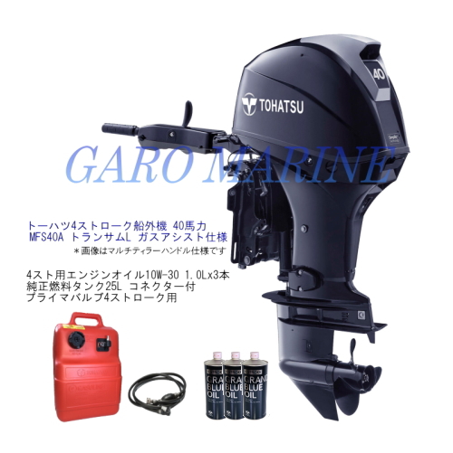 トーハツ 船外機 4ストローク 40馬力 MFS40A-EGL トランサムL ガスアシスト仕様 エンジンオイル1.0Lx3本 燃料タンク25L 燃料ホース付 法人様発送 送料無料